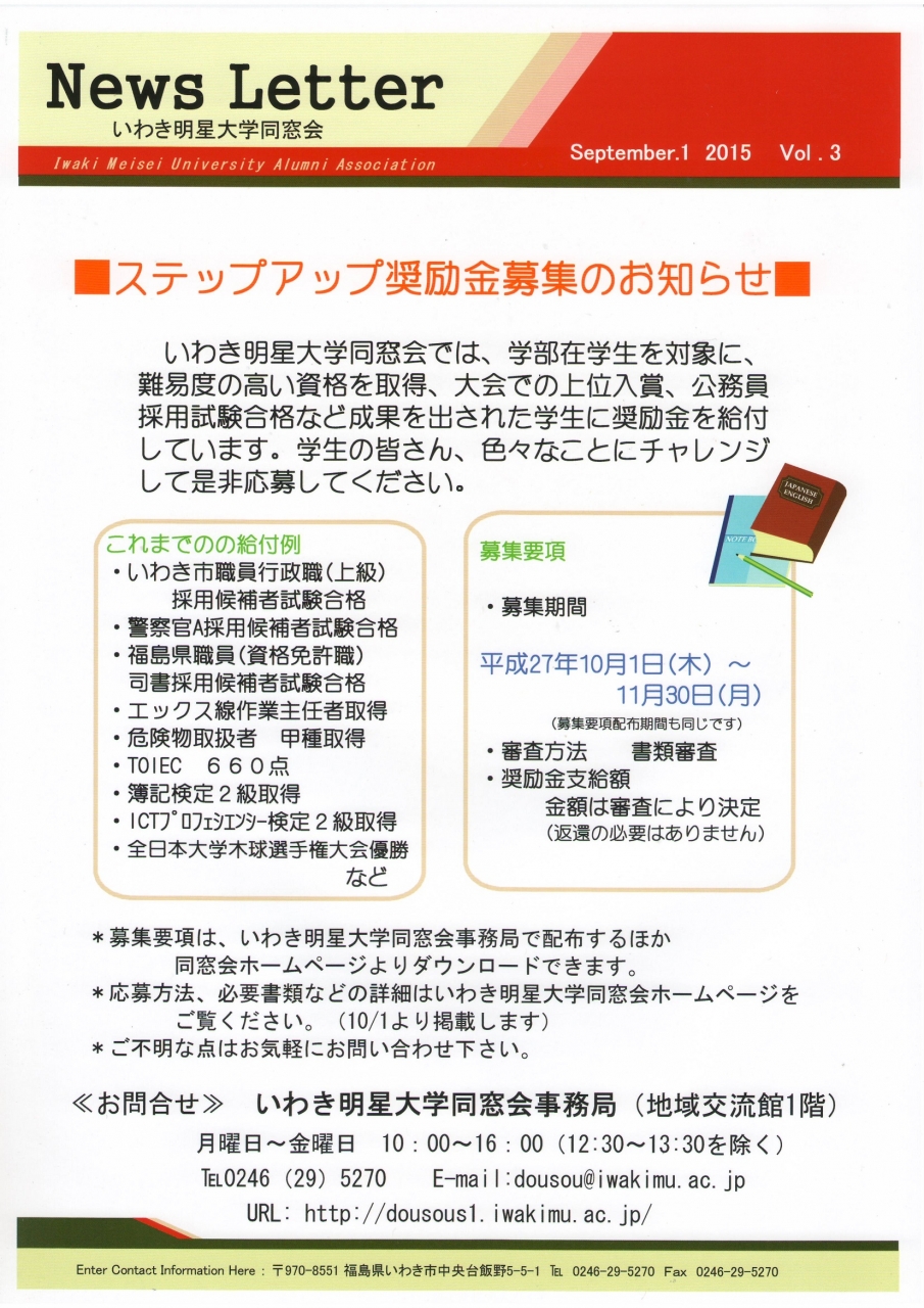 いわき明星大学同窓会では、「ステップアップ奨励金」の募集を行います。