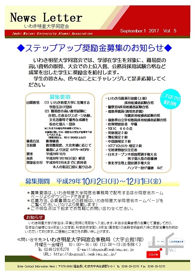 いわき明星大学同窓会では、ステップアップ奨励金の募集を行います。