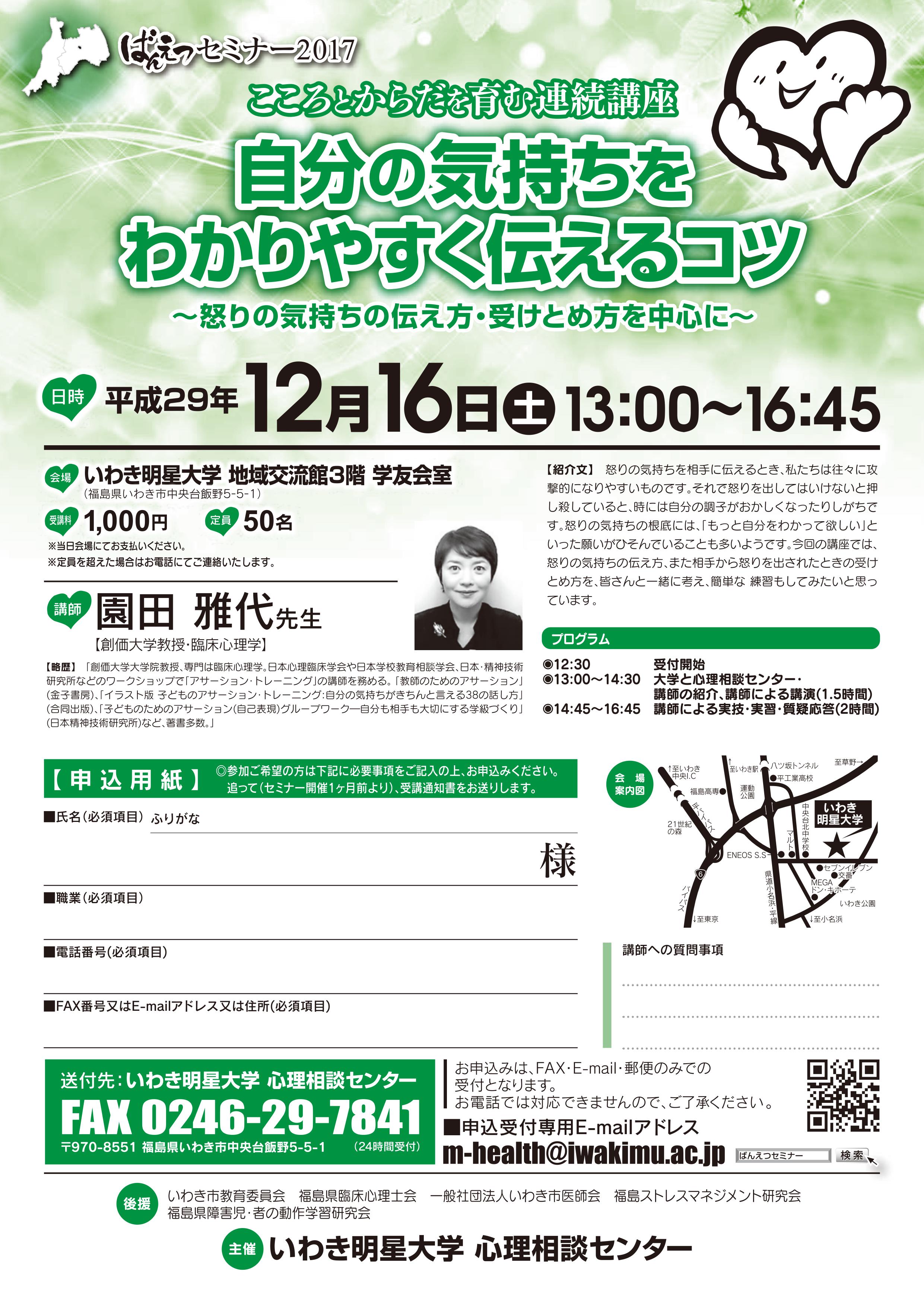 心理相談センターからのお知らせです。2007年度より開催し、ご好評いただきました“ばんえつセミナー”を本年度も「こころとからだを育む連続講座」として開催します。これまで同様、体験・参加型の形式で、講師と参加者の交流を重視した実践的なスタイルを取り入れた内容です。詳しくは