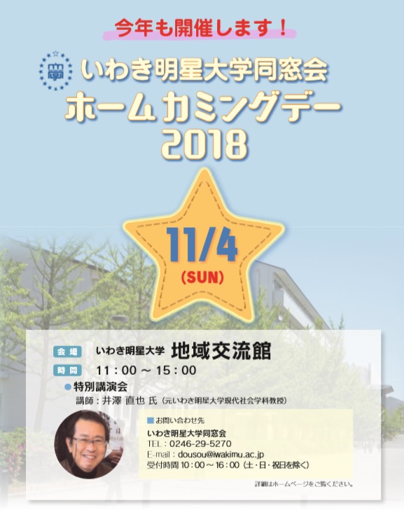 今年も、大学の学園祭に合わせ、同窓生の集い「ホームカミングデー」を開催します。この機会に、ご友人やご家族と共に皆様が青春時代を過ごした大学にお越しいただき、同窓生同士の絆を深めていいただきたいと思います。もちろん、お一人での参加も大歓迎です。皆様のご来場をお待ちしております。
