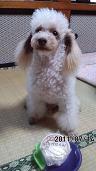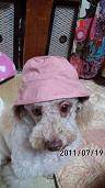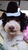 我家の愛犬が、お誕生日を迎えました。プレゼントされた帽子がどうも気にいらないらしく、なさけない顔をしています。