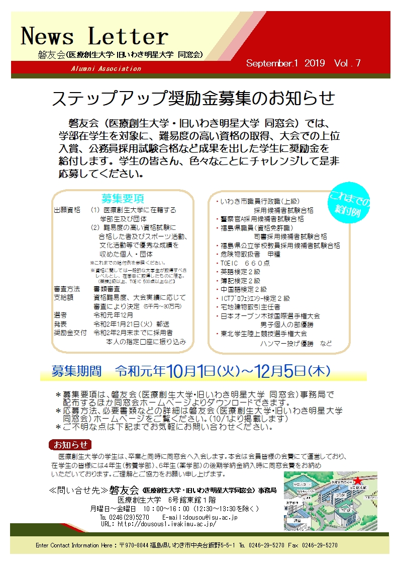 磐友会(医療創生大学・旧いわき明星大学 同窓会)ではステップアップ奨励金の募集を行います。